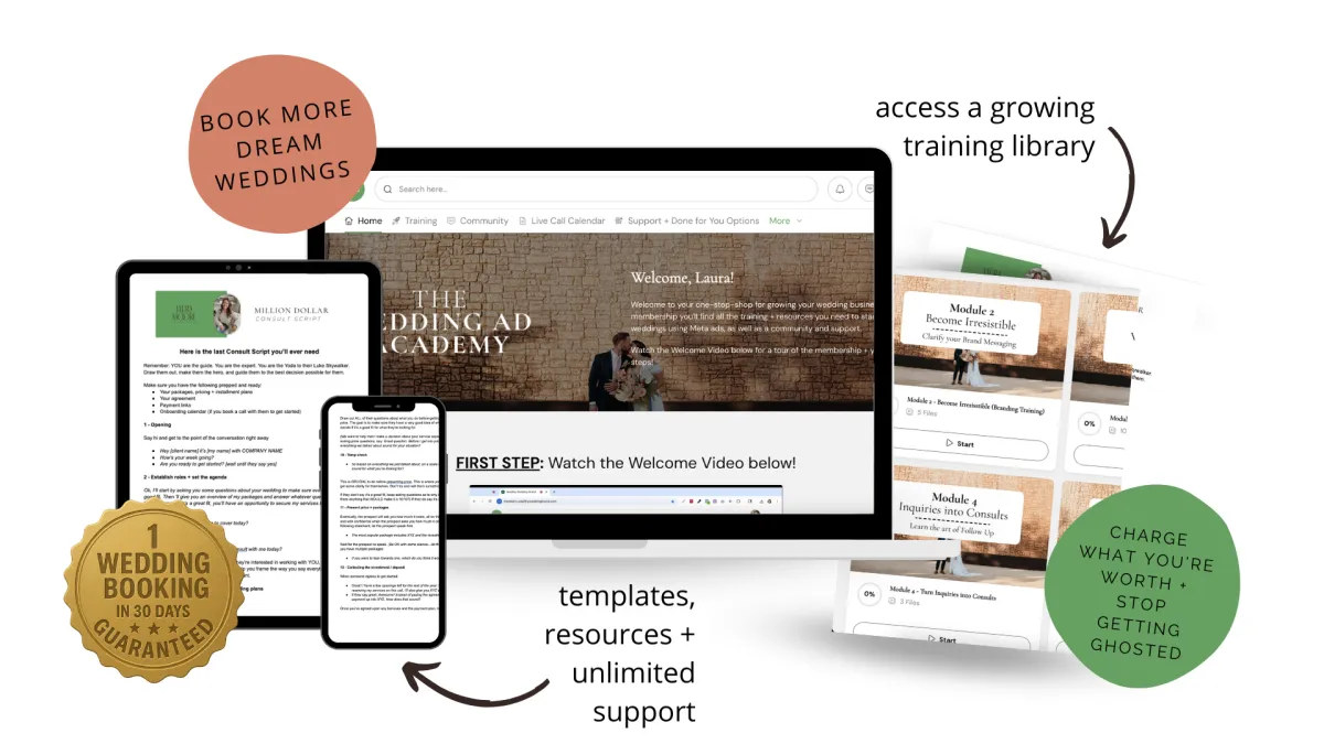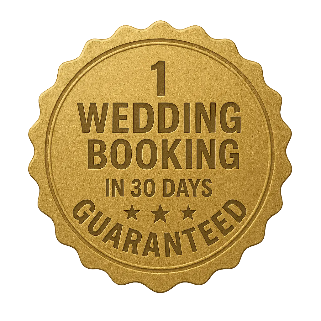 Inside, you get the exact tools, templates, and support to book better weddings—without guessing, ghosting, or giving discounts.